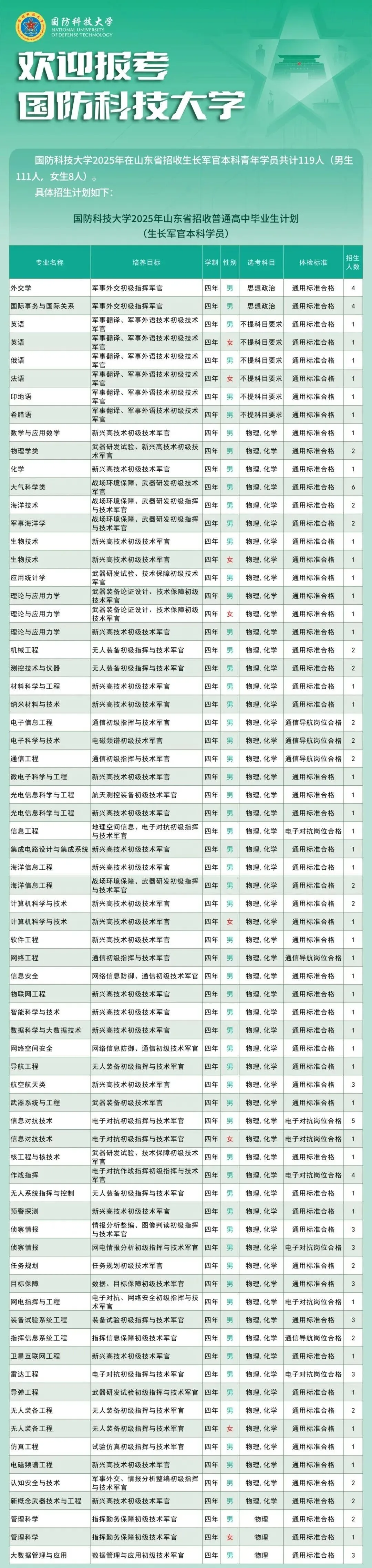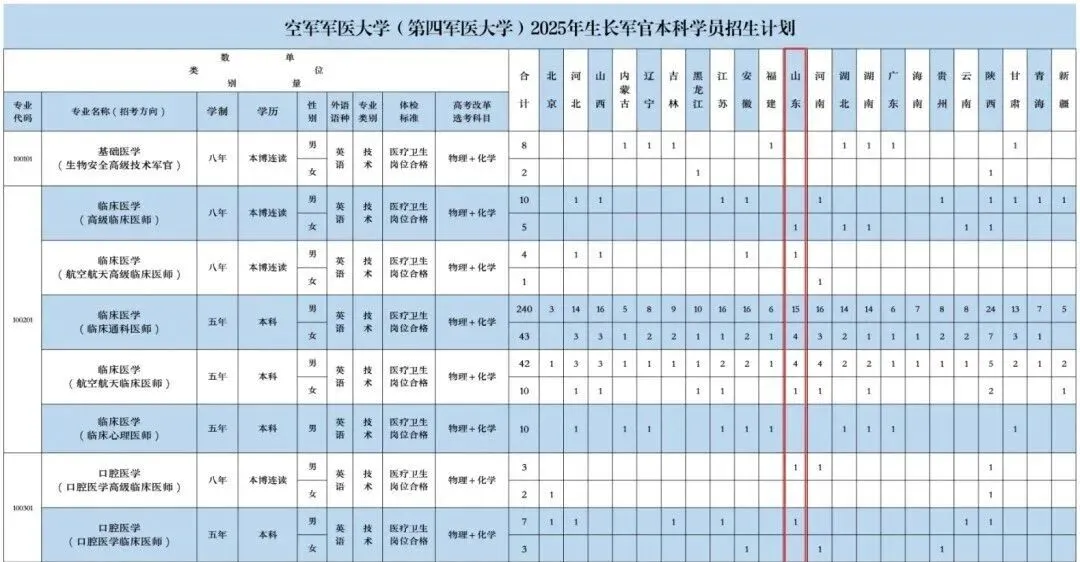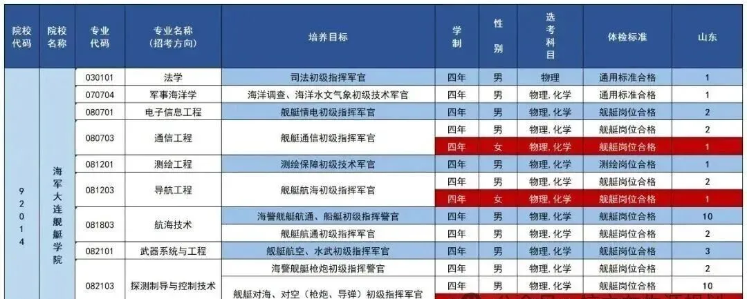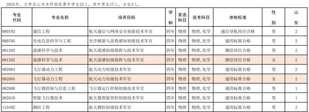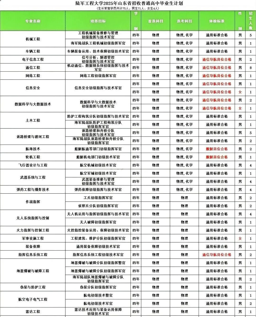 2025年全军22所军校在山东共投放招生计划1250人,整体规模稳定,为考生提供了充足的录取机会 。其中男生计划1156人,女生计划94人;