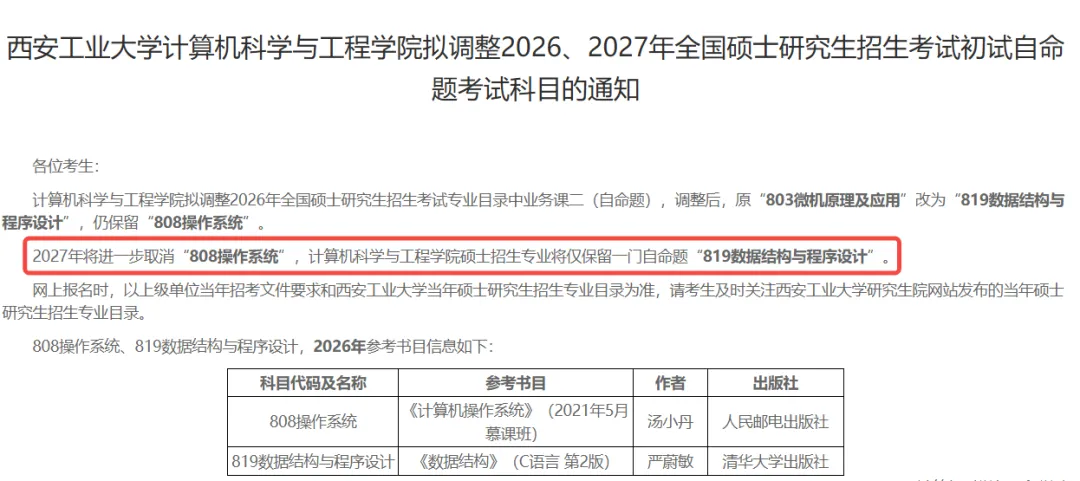 西安工业大学计算机科学与工程学院发布了拟调整2026、2027年全国硕士研究生招生考试初试自命题考试科目的通知