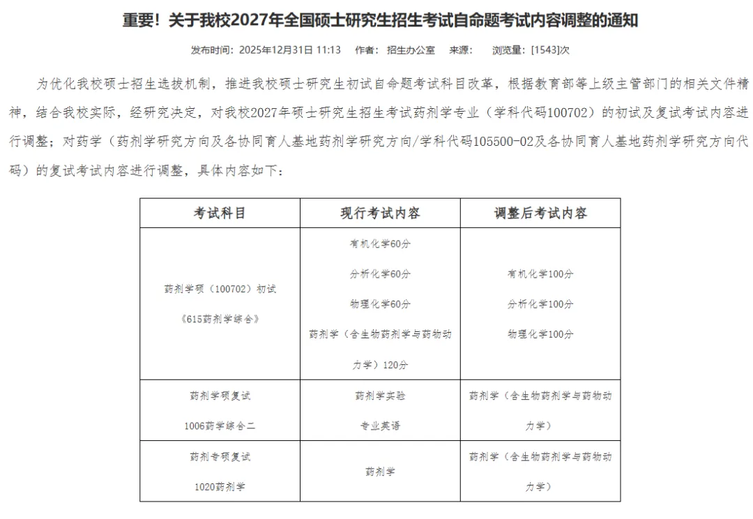 药剂学硕(100702)初试《615 药剂学综合》调整为有机化学、分析化学、物理化学各 100 分,取消药剂学内容