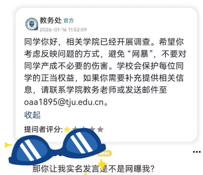 这么怀疑是正确的,因为天大教务处的回应,显然就是为了这个目的。天大教务处回应称:同学你好,相关学院已经开展调查。希望你考虑反映问题的方式,避免"网暴",不要对同学产成不必要的伤害。学校会保护每位同学的正当权益,如果你需要补充提供相关信息,请联系学院教务老师或发送邮件至。