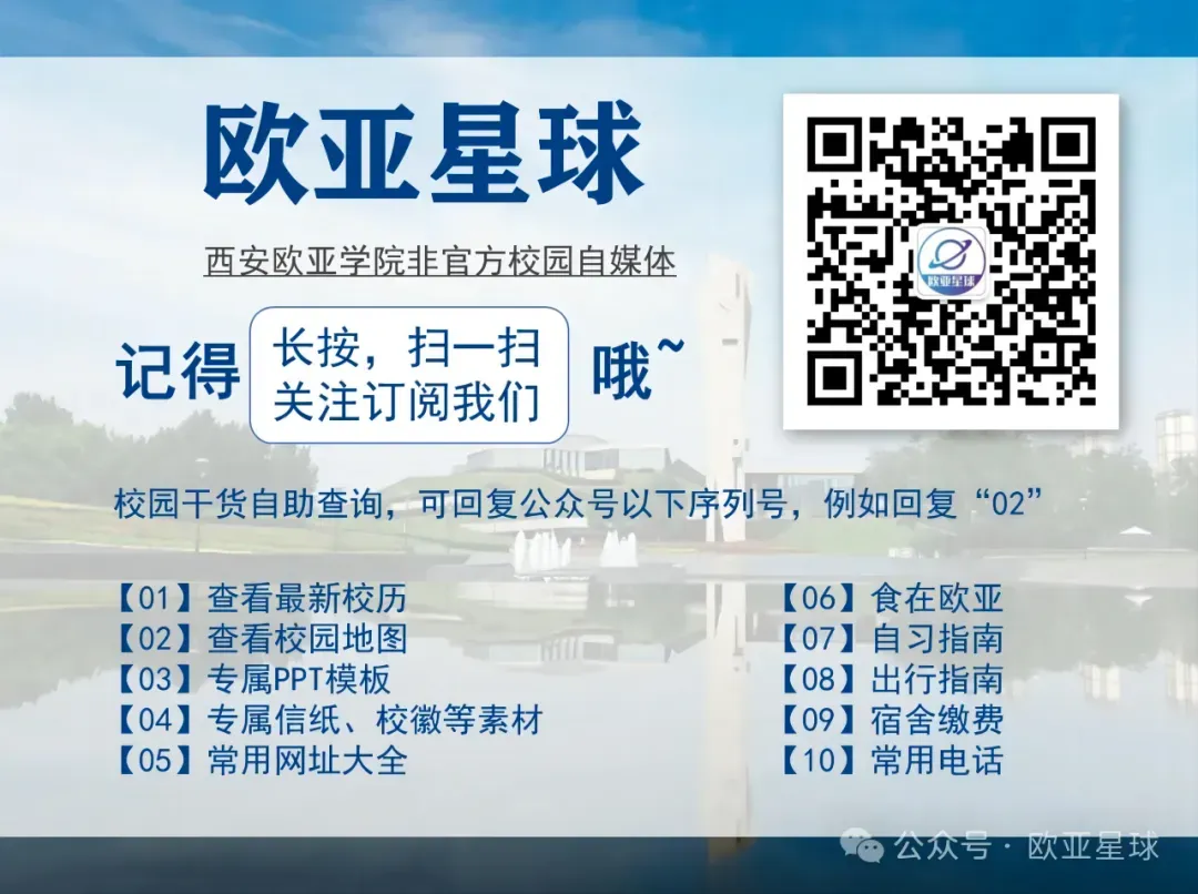 --关注微信公众号“欧亚星球”--西安欧亚学院PPT模板来了~西安欧亚学院简历模板~西安欧亚学院历年期中期末真题来了~欧亚2025专业排名!欧亚几个专业上榜?欧亚排名上升!25中国民办大学排名发布!欧亚毕业生薪资爆料第1期!欧亚几人?陕西省2025拟录用公务员公示!西安欧亚学院四六级考试一站式扫盲