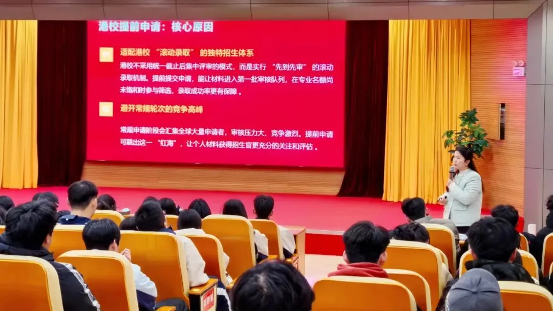 分享会伊始,王老师以“为什么选择香港?”为引,从国际化视野、学术资源、地理文化优势等多个维度,系统梳理了香港高等教育的独特价值。她结合多年指导经验指出,香港高校既融合中西教育精髓,又背靠祖国、联通世界,为学生的学术发展与职业规划提供了多元可能。