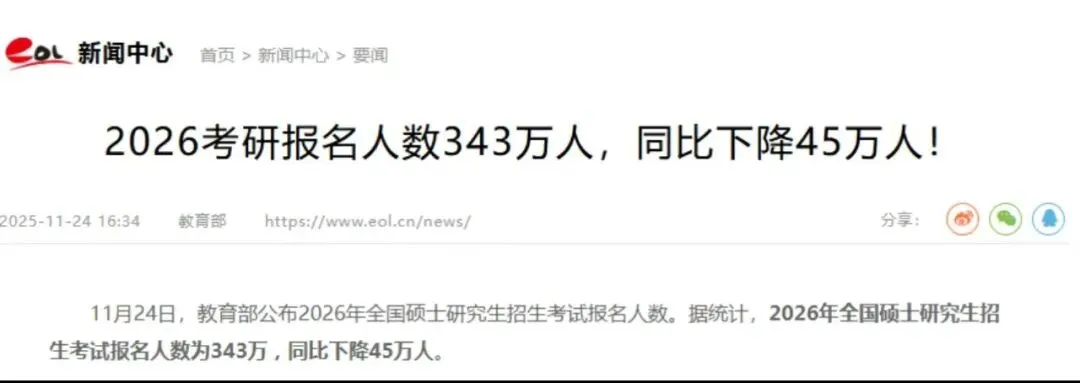 教育部最新官宣,2026年考研报名人数仅343万,比2025年暴跌45万——这相当于少了一整个“考研大省”的报考规模,更是继2024年后连续第三年下滑!