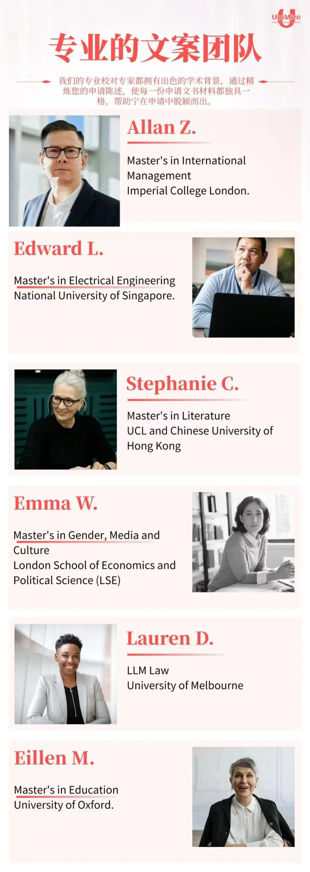 Unimize Global Limited 是一家知名的留学咨询公司,专门致力于为全球留学生提供全流程的留学以及后期配套服务, 帮助并引导每一位学生在走向海外接受教育的同时, 全方位优化每一位学生的留学体验。我们提供多元化的服务,包括本/硕/博留学咨询、论文精修、一对一海外学习生活导师,以及为出国留学的学生提供无缝衔接的旅行安排。我们致力于提供定制化解决方案,帮助每一个留学生获得最大化的留学体验。