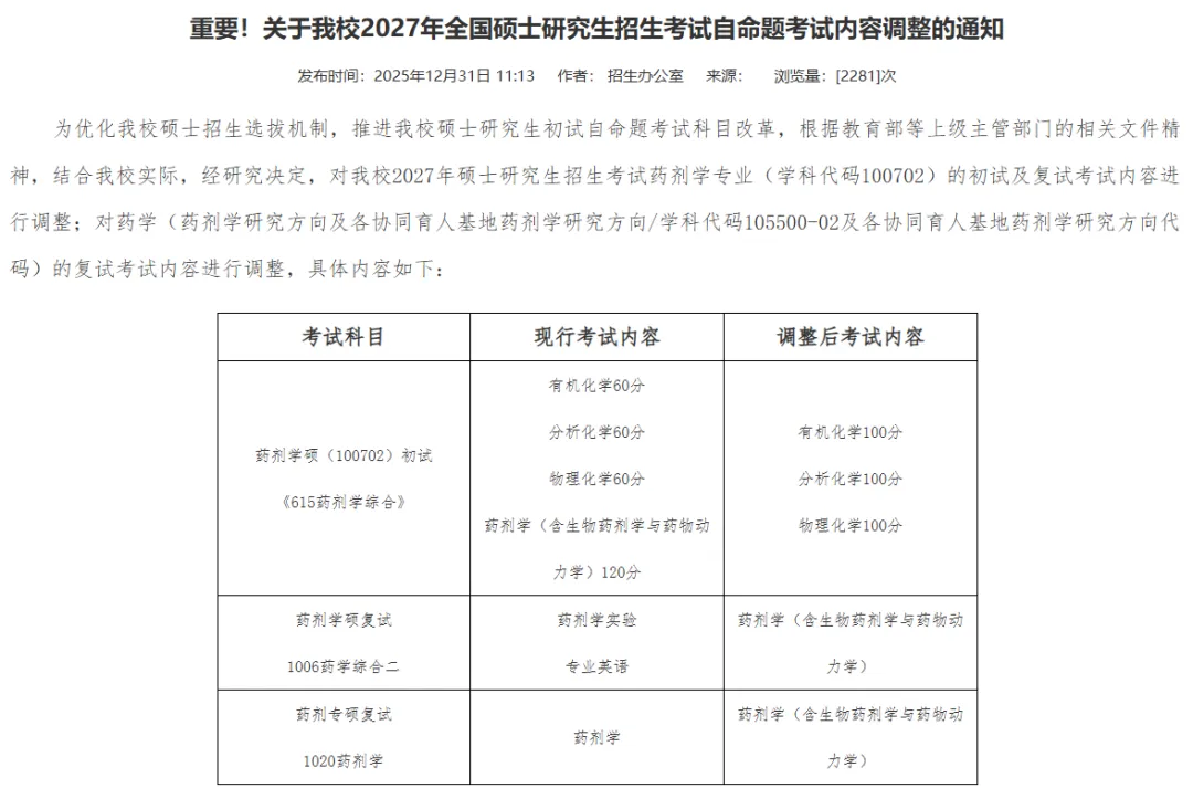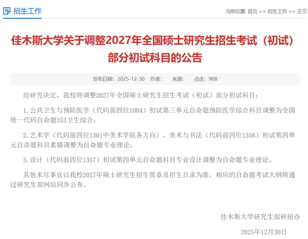 日前,部分招生单位发布了27研考初试调整的信息,今天给大家汇总一下。同时,给27研考的同学们提个醒,一定要时刻关注招生单位发布的考试相关动态,及时调整备考安排。