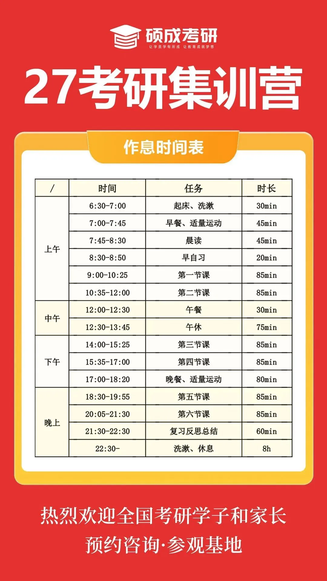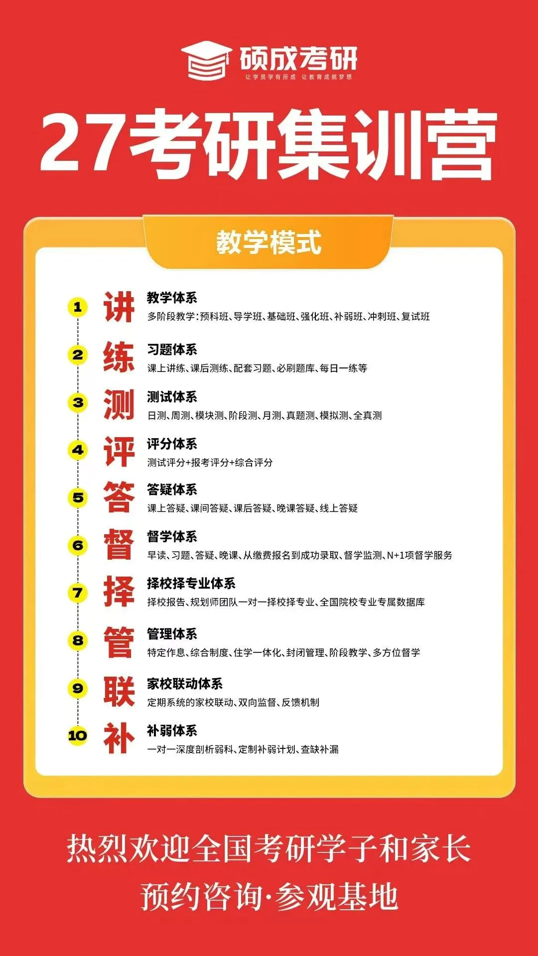 硕成考研27考研全年集训1班正式开营!在这个备考的关键起点,我们为学子们准备了全封闭备考环境与系统化教学体系,六大核心优势,打造考研备考新标杆!