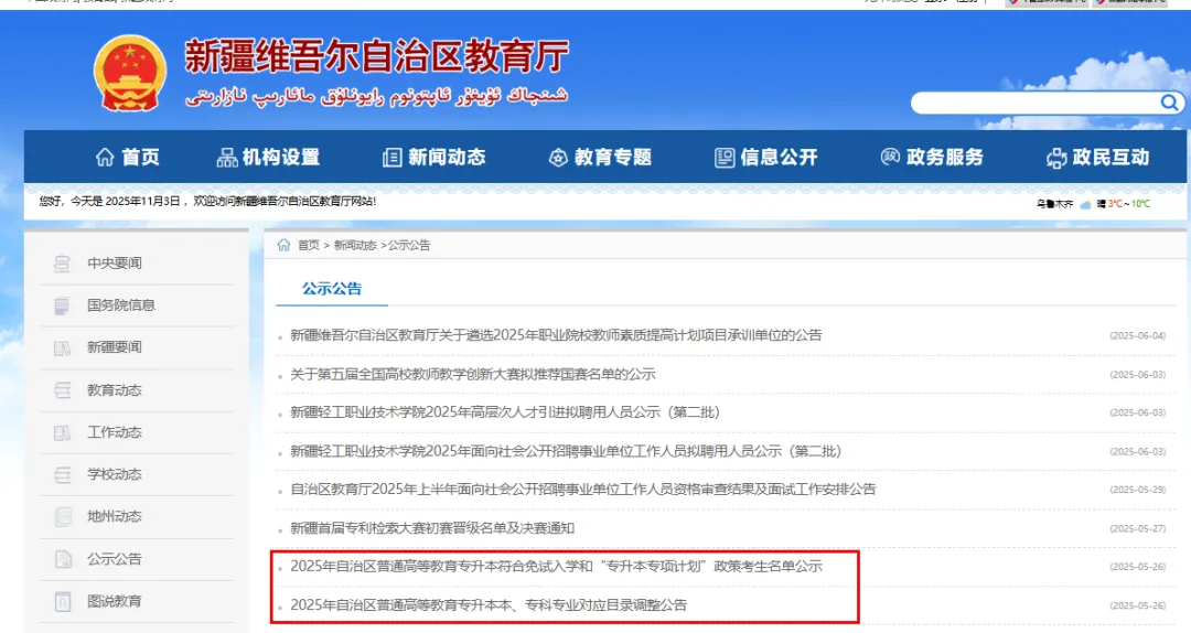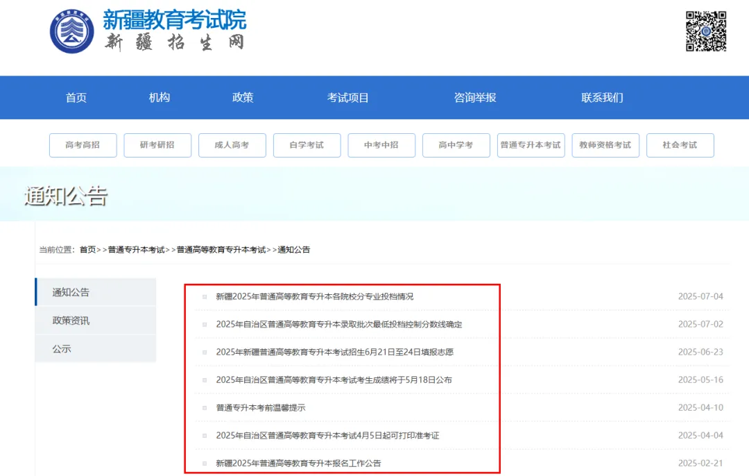 以上是新疆专升本18所院校的官网汇总,同学们可以在浏览器打开进入学校首页,然后进入各个院校的“招生就业”板块,里面会发布新疆专升本招生简章等重要资讯。