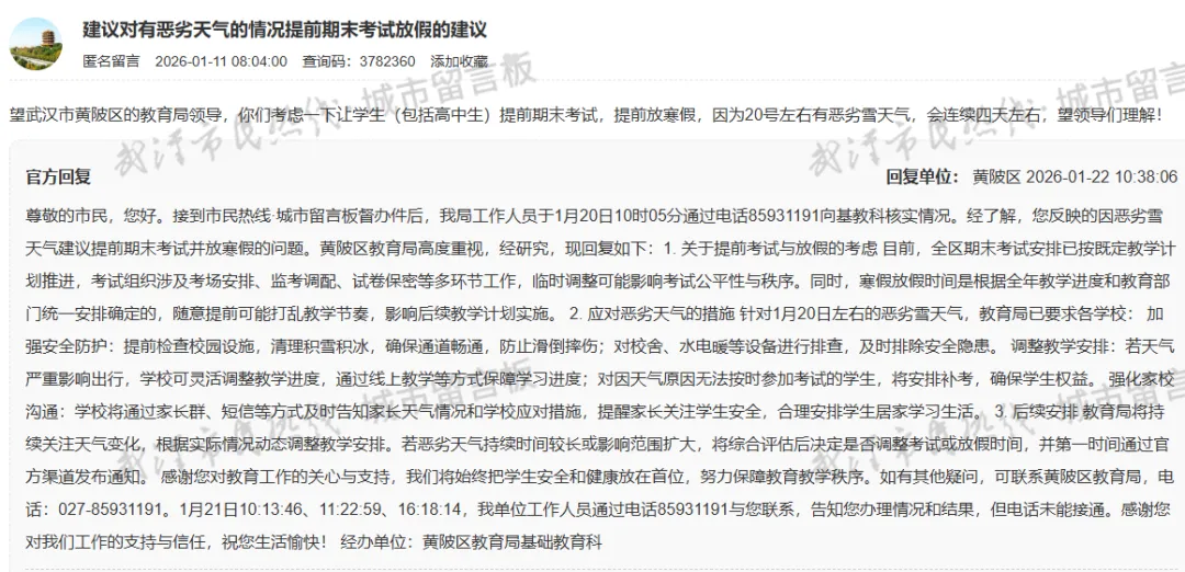 网友:望武汉市黄陂区的教育局领导,你们考虑一下让学生(包括高中生)提前期末考试,提前放寒假,因为20号左右有恶劣雪天气,会连续四天左右,望领导们理解!尊敬的市民,您好。接到市民热线·城市留言板督办件后,我局工作人员于1月20日10时05分通过电话85931191向基教科核实情况。经了解,您反映的因恶劣雪天气建议提前期末考试并放寒假的问题。黄陂区教育局高度重视,经研究,现回复如下:1. 关于提前考试与放假的考虑 目前,全区期末考试安排已按既定教学计划推进,考试组织涉及考场安排、监考调配、试卷保密等多环节工作,临时调整可能影响考试公平性与秩序。同时,寒假放假时间是根据全年教学进度和教育部门统一安排确定的,随意提前可能打乱教学节奏,影响后续教学计划实施。 2. 应对恶劣天气的措施 针对1月20日左右的恶劣雪天气,教育局已要求各学校: 加强安全防护:提前检查校园设施,清理积雪积冰,确保通道畅通,防止滑倒摔伤;对校舍、水电暖等设备进行排查,及时排除安全隐患。 调整教学安排:若天气严重影响出行,学校可灵活调整教学进度,通过线上教学等方式保障学习进度;对因天气原因无法按时参加考试的学生,将安排补考,确保学生权益。 强化家校沟通:学校将通过家长群、短信等方式及时告知家长天气情况和学校应对措施,提醒家长关注学生安全,合理安排学生居家学习生活。 3. 后续安排 教育局将持续关注天气变化,根据实际情况动态调整教学安排。若恶劣天气持续时间较长或影响范围扩大,将综合评估后决定是否调整考试或放假时间,并第一时间通过官方渠道发布通知。 感谢您对教育工作的关心与支持,我们将始终把学生安全和健康放在首位,努力保障教育教学秩序。如有其他疑问,可联系黄陂区教育局,电话:027-85931191。1月21日10:13:46、11:22:59、16:18:14,我单位工作人员通过电话85931191与您联系,告知您办理情况和结果,但电话未能接通。感谢您对我们工作的支持与信任,祝您生活愉快! 经办单位:黄陂区教育局基础教育科。