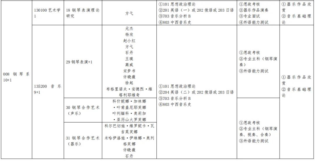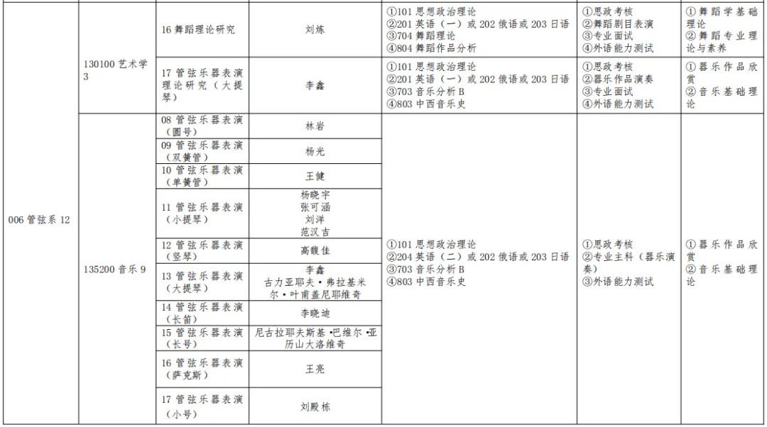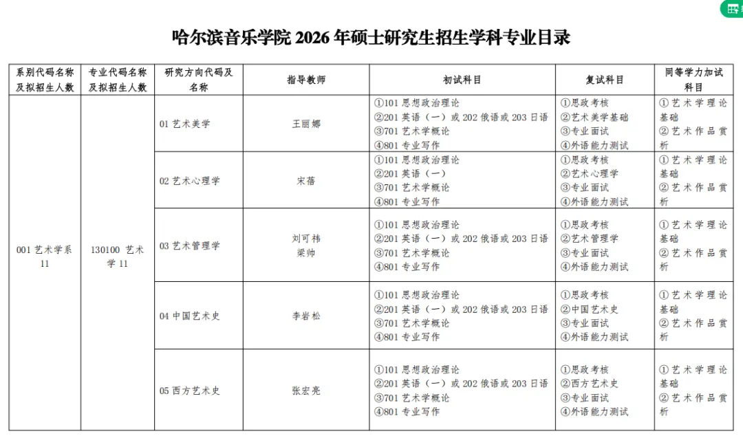 2026年我院的招生学科专业为艺术学一级学科和音乐专业。总计划预计为130人,其中全日制招生计划为125人,非全日制招生计划为5人;全日制招生计划中,学术学位招生计划为49人,专业学位招生计划为76人;非全日制招生计划均为专业学位招生计划。预分的分系分专业招生计划详见《哈尔滨音乐学院2026年硕士研究生招生学科专业目录》,其中本目录中标注的拟招生人数不包含拟接收推免生人数,如实际接收推免生人数小于推免生接收计划,剩余名额将返回普通招考。其中,最终的分系分专业计划将在明年初教育部招生计划下达后,结合学院实际接收推免生情况对各专业招生计划进行合理调整。初试自命题科目考试大纲、复试要求、导师简介等将另行公布。