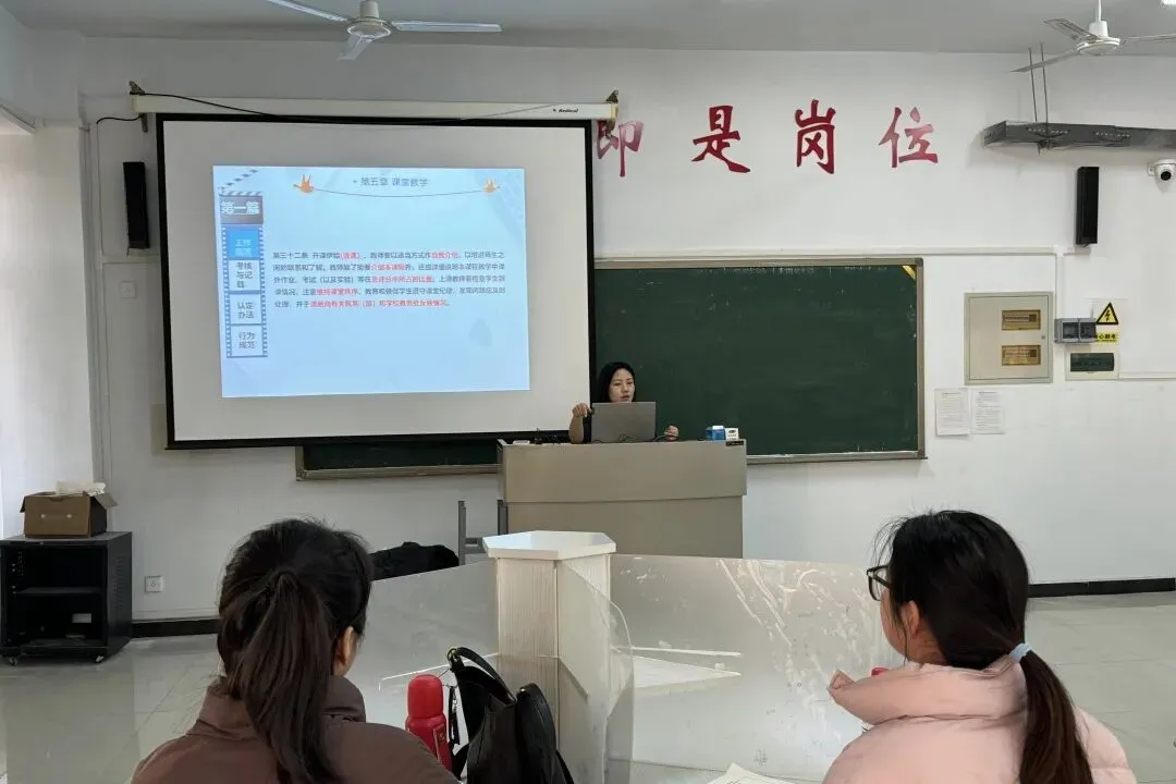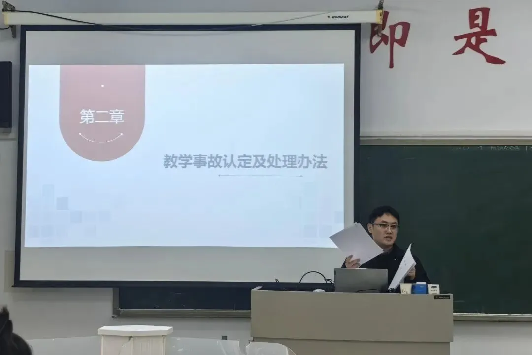 和刚主任对国家职业教育政策与发展动态进行深入剖析。赵艳副处长与杜喜坤老师系统介绍了学院教学管理规范、师德师风准则以及教学事故认定流程。刘文洁老师就高校教师资格认定、职称晋升路径及“双师型”教师发展等内容进行说明,为新教师的职业成长提供清晰指南。