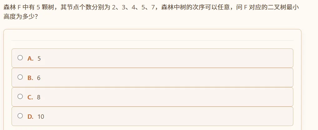 今天我们来看一下 2026 年 408 真题数据结构部分的第四道选择题。这个题目是关于森林转换成二叉树,并求解二叉树的最小高度。