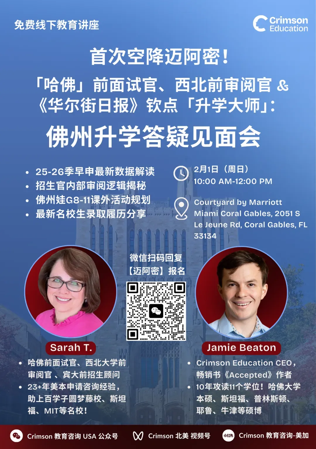 为帮助佛罗里达华裔家庭打破名校申请信息差,Crimson将于2月1日 (周日) 举办首场【迈阿密线下升学讲座】,特邀哈佛前面试官、西北前审阅官」Sarah 「“哈耶普斯”学霸、 《华尔街日报》钦点“升学大师”」Jamie 亲临现场!