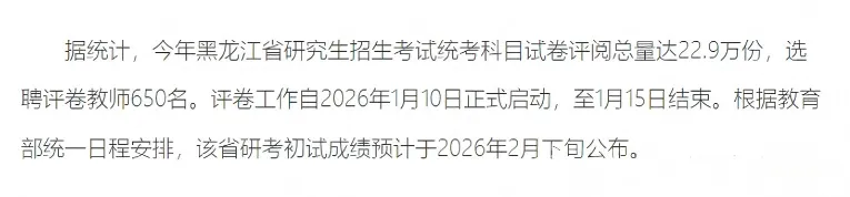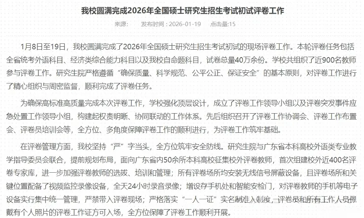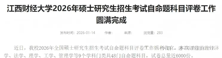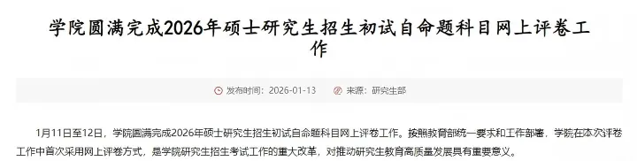 距离2026考研初试已经过去接近1个月了,目前各地阅卷工作也都已接近尾声,已经有学校发布了阅卷结束的通知!评卷工作自2026年1月10日正式启动,至1月15日结束。来源链接:https://edu.cnr.cn/list/20260117/t20260117_527496179.shtml