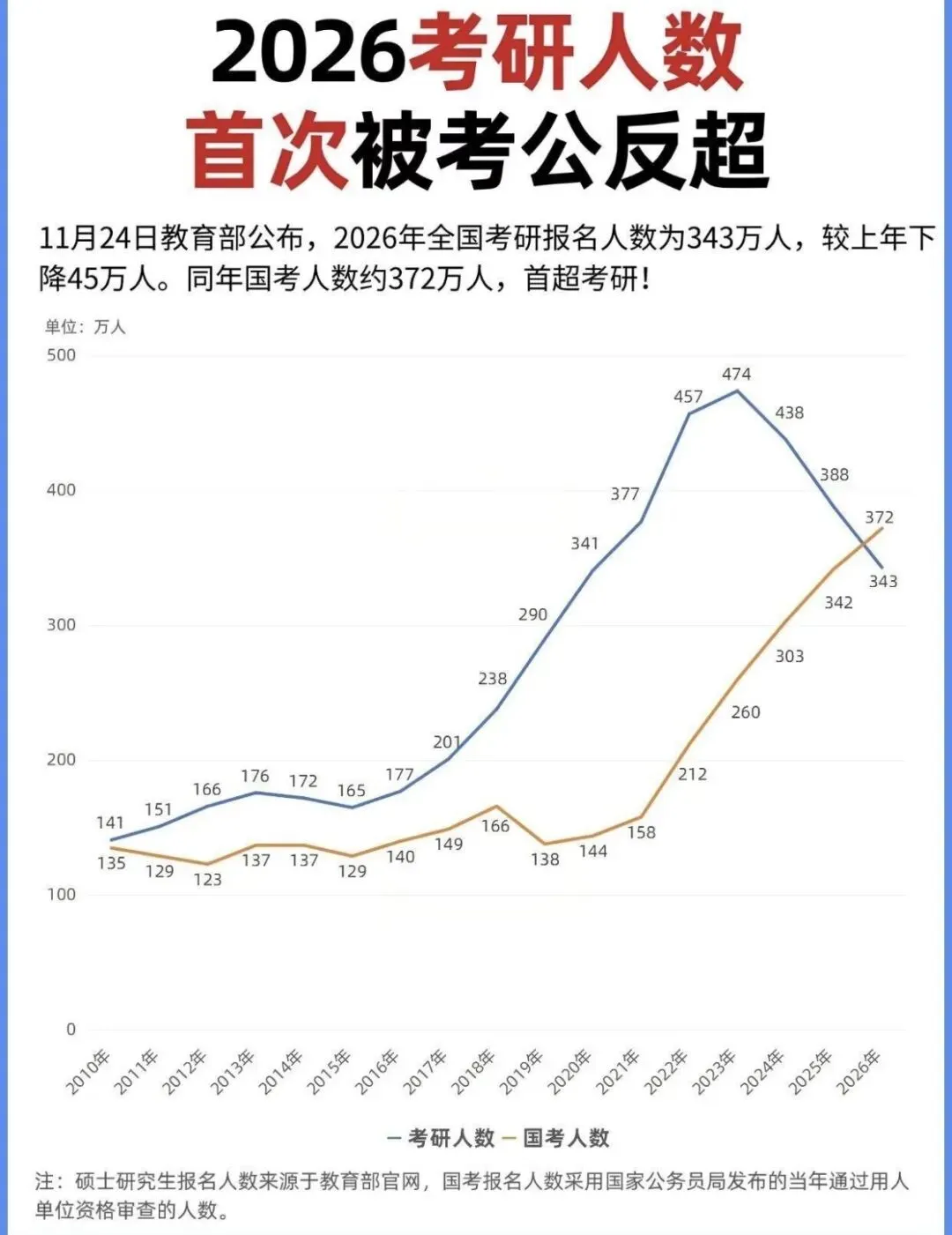 2026年全国考研报名人数跌至343万,较2025年再减45万,实现连续三年下滑,较2023年474万的峰值更是锐减131万,十年来首次迎来考研报名“三连降”;而另一边国考彻底迈入“卷王时代”,报名人数首超考研达371.8万,仅3.81万个招录岗位,平均98人争抢1席,热门岗位报录比更是飙至6470:1,竞争烈度远超“千军万马过独木桥”,直接进入“神仙打架”模式。 1270万毕业生扎堆就业,也让考研、考公的赛道愈发拥挤。