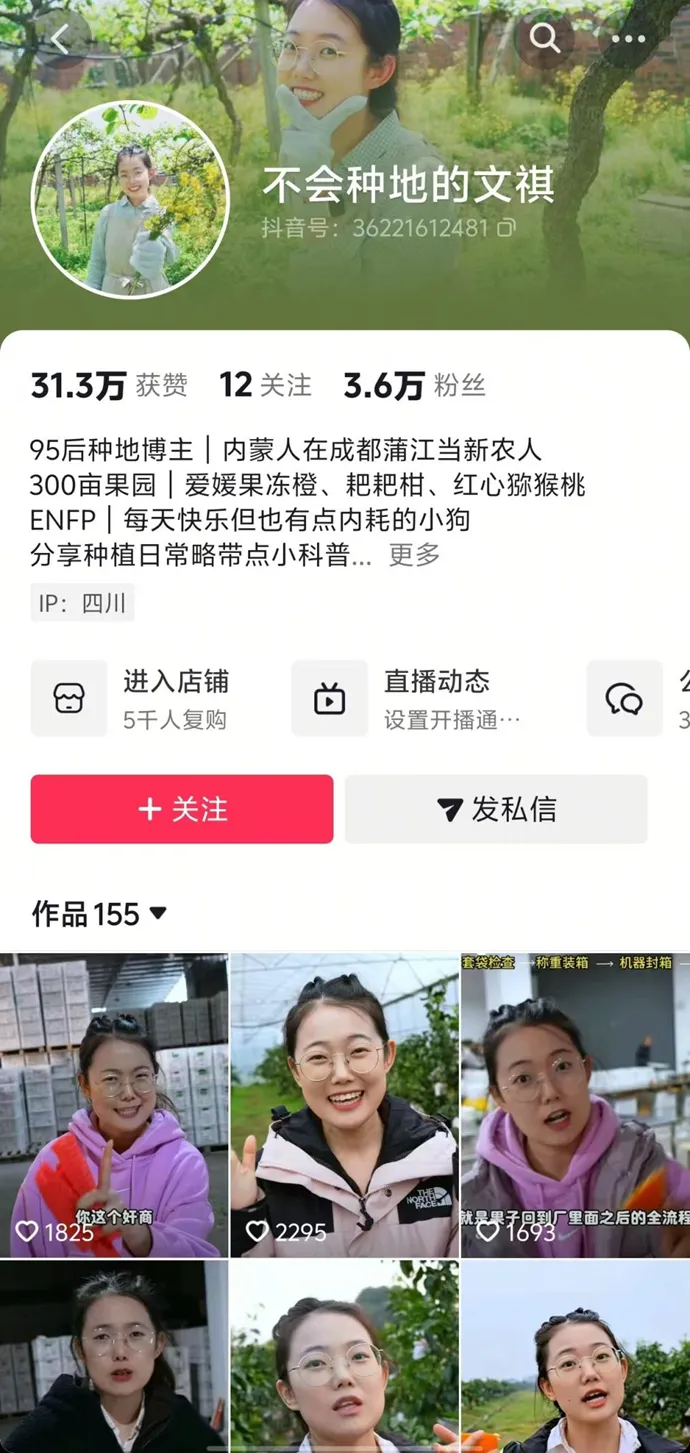 据悉,95后内蒙女生赵文祺和男友在各自经历考研失败、工作失业后,来到其男友老家蒲江(四川农村)创业当农民。从零经验到如今管理300亩猕猴桃、耙耙柑、爱媛橙果园,他们开设专门账号记录种植过程,吸引了众多网友“云养水果”。