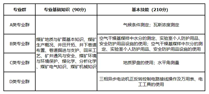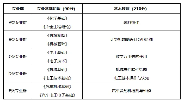 专业基础知识考试采用机试办法,考试时间60分钟;基本技能考试根据A、B、C、D、E五个专业群的专业标准进行内容不同的操作考试,采用手工操作、设备操作、现场展示或陈述答辩形式。