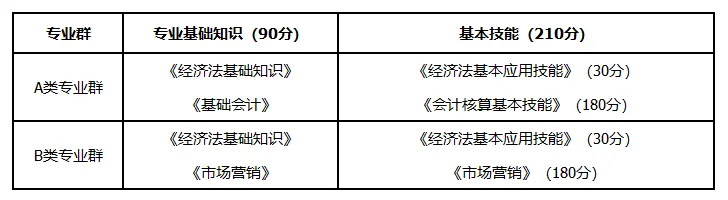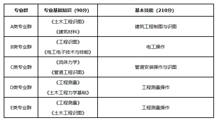 专业基础知识考试采用机试办法,考试时间60分钟;基本技能考试办法如下:A类、B类专业群为机试,考试时间120分钟;C类专业群为机试和现场操作测试,考试时间120分钟;D类专业群为机试和现场面试,考试时间120分钟。