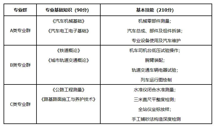 根据省教育厅下发的《山西省中等职业学校毕业生对口升学考试交通运输类专业职业技能考试大纲(试行)》,本专业职业技能考试分专业基础知识考试和基本技能考试两部分,满分300分,其中:专业基础知识90分,基本技能210分,考试成绩结果体现为“合格”和“不合格”。考试内容如下: