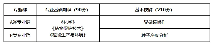 专业基础知识考试采用机试办法,考试时间60分钟;基本技能考试为现场操作测试,采用手工操作、设备操作等形式,考试时间40分钟,A类专业群考试项目为“显微镜操作”;B类专业群考试项目为“种子净度分析”。