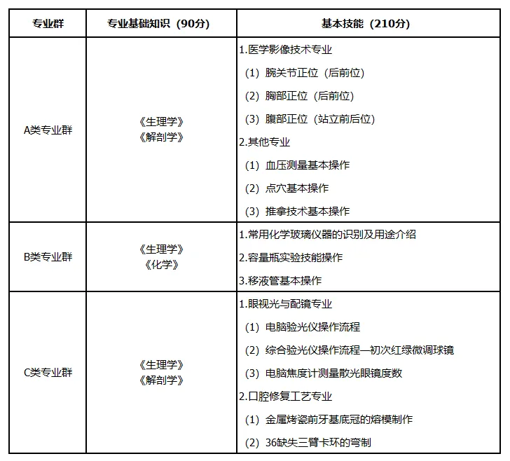 根据省教育厅下发的《山西省中等职业学校毕业生对口升学考试医学相关类专业职业技能考试大纲(试行)》,本专业职业技能考试分专业基础知识考试和基本技能考试两部分,满分300分,其中:专业基础知识90分,基本技能210分,考试成绩结果体现为“合格”和“不合格”。考试内容如下: