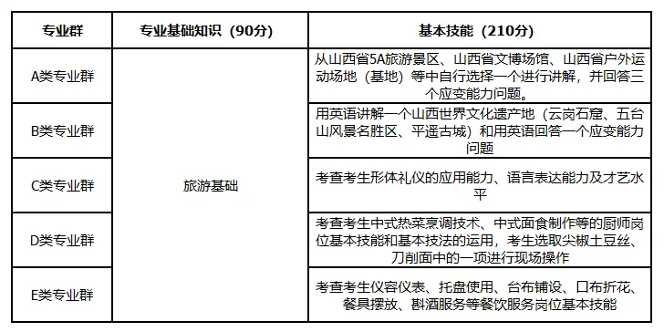 根据省教育厅下发的《山西省中等职业学校毕业生对口升学考试旅游服务类专业职业技能考试大纲(试行)》,本专业职业技能考试分专业基础知识考试和基本技能考试两部分,满分300分,其中:专业基础知识90分,基本技能210分,考试成绩结果体现为“合格”和“不合格”。考试内容如下: