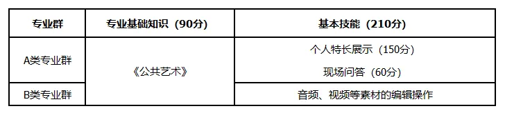 根据省教育厅下发的《山西省中等职业学校毕业生对口升学考试文化传媒类专业职业技能考试大纲(试行)》,本专业职业技能考试分专业基础知识考试和基本技能考试两部分,满分300分,其中:专业基础知识90分,基本技能210分,考试成绩结果体现为“合格”和“不合格”。考试内容如下: