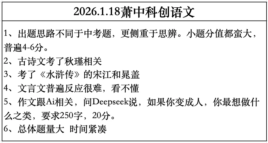 县中除了萧中科创班,接下来还有余高的创新班选拔,富中的科创班考试都是家长比较关心的话题。那么余杭区的自主招生考试,无论是考试科目还是录取流程,都与萧中科创班极其类似,余杭临平区的家长可以重点参考! 如果您的目标是头部学校实验班,这次考试的回忆版真题建议大家提前刷掉,2026中考自主招生群已建立,我们将在群里进行不定时分享真题,欢迎家长朋友进群交流~