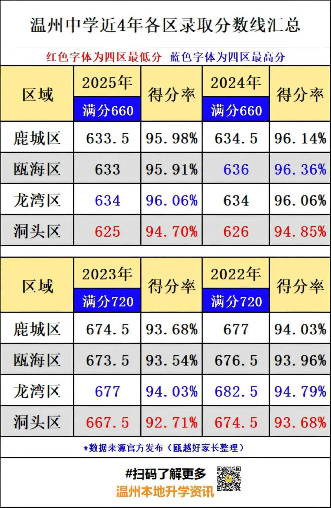 通过2022-2025年温州中学在鹿城、瓯海、龙湾、洞头的录取分数线和得分率,我们从中可以清晰发现四区之间的梯队差异 ↓