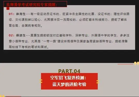 解读:复选检测全程实行单项淘汰制,检测内容包括医学选拔、心理选拔以及政治考核谈话,完成所有检测项目需2~3天。