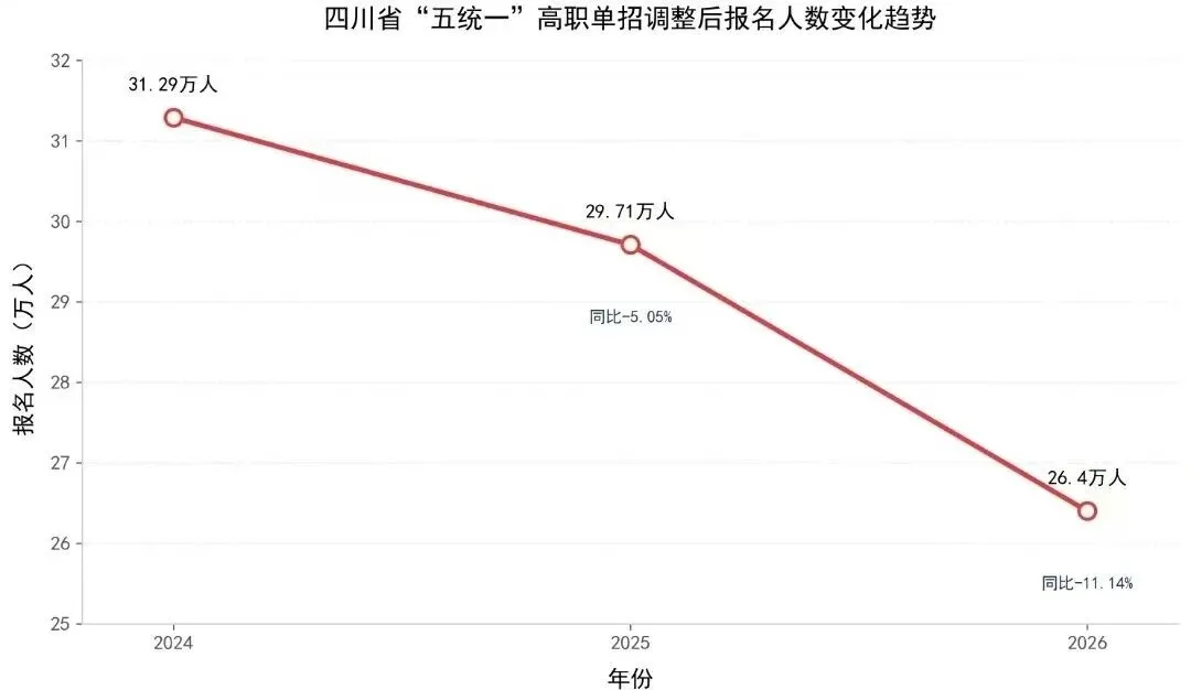 报考人数较2025年减少3万余人、同比下降11.14个百分点;普高类报名人数较去年同期下降9.79%、中职类下降11.85%。
