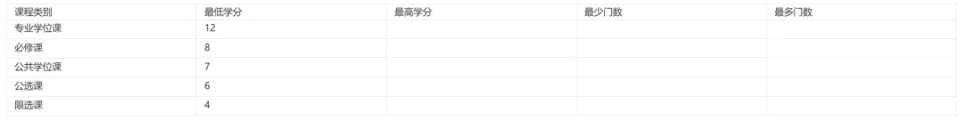课程采取学分制。总课程学分37学分,其中,学位课19学分、必修课8学分和选修课10学分。