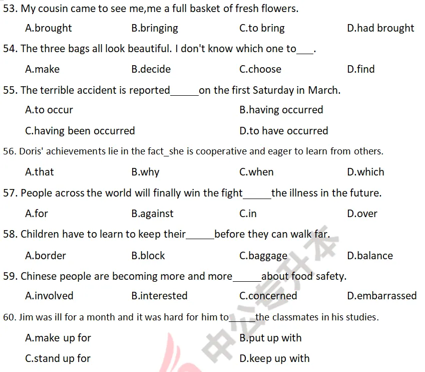 Directions: In this part, there are 60 incomplete sentences. For each sentence there are four choices marked A, B, C and D. Choose the ONE that best completes the sentence. Then mark the corresponding letter on the Answer Sheetwith a single line through the centre.