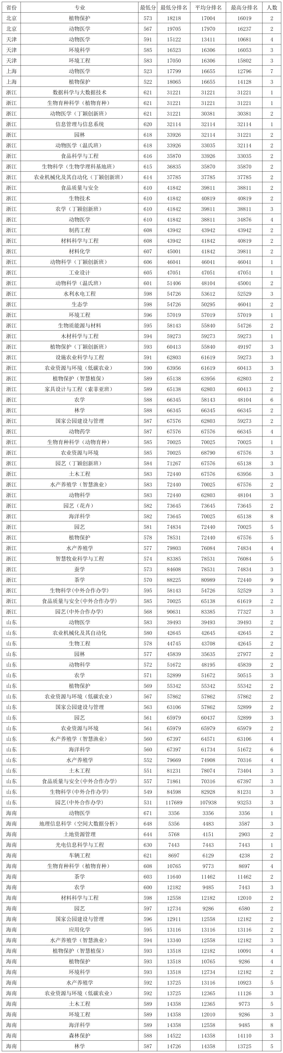 华南农业大学2025年在浙江本科批录取分数线较高的专业:数据科学与大数据技术621分、生物育种科学(植物育种)621分、动物医学(丁颖创新班)621分、信息管理与信息系统620分,最低的是茶学570分,最低分位次88225。