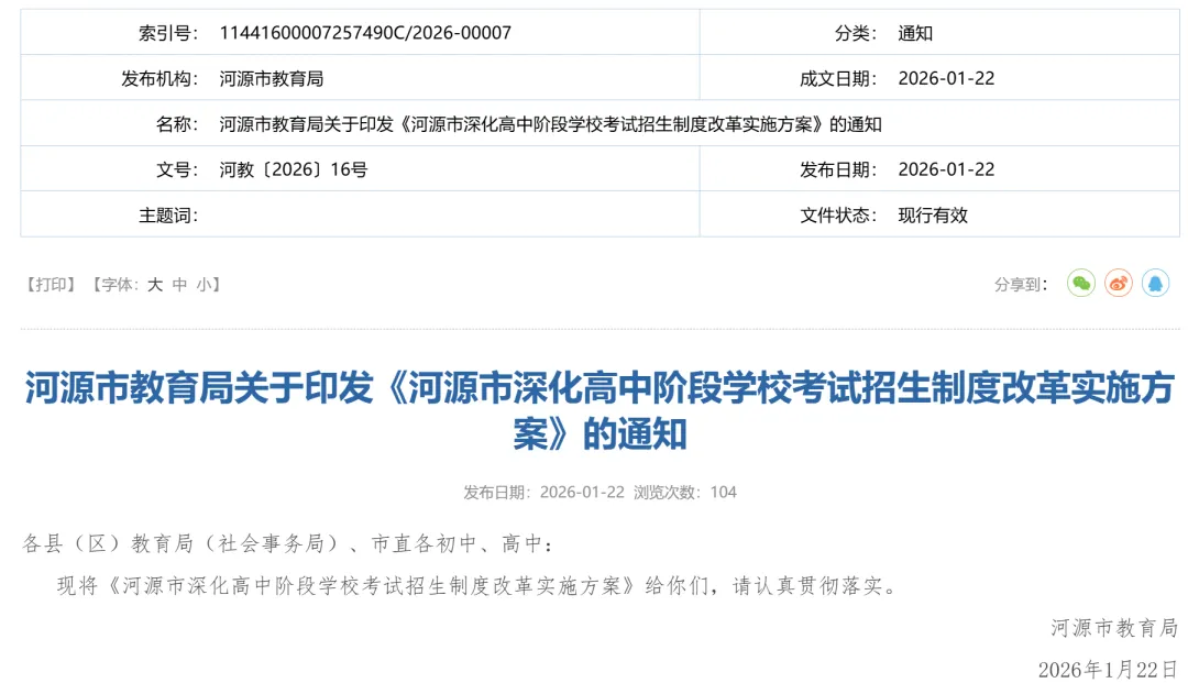 1月22日,河源市教育局印发《河源市深化高中阶段学校考试招生制度改革实施方案》(以下简称《实施方案》)。《实施方案》自2026年1月22日起实施,有效期5年。