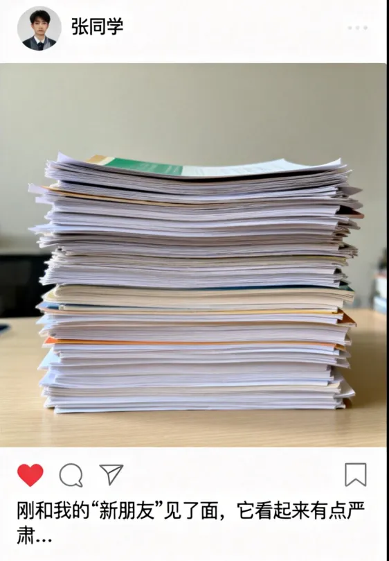 学习前: 朋友圈发图是厚厚的一摞参考书,配文:“刚和我的‘新朋友’见了面,它看起来有点严肃…”