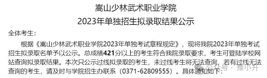 嵩山少林武术职业学院2023年单招录取分数线