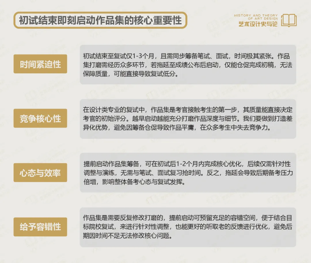 考研初试结束后不意味着就可以“摆烂”了,这段时间是作品集筹备的黄金期,直接决定复试成败!特别需优先启动、反复打磨,重点突出个人风格与设计思维。下面我们分别从启动作品集的重要性、核心难点、最终目标来说明。