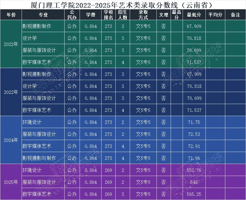 厦门理工学院艺术类招生专业有视觉传达设计、环境设计、服装与服饰设计、数字媒体艺术、产品设计、影视摄影与制作、播音与主持艺术、表演。近四年在云南省招生录取分数线如下: