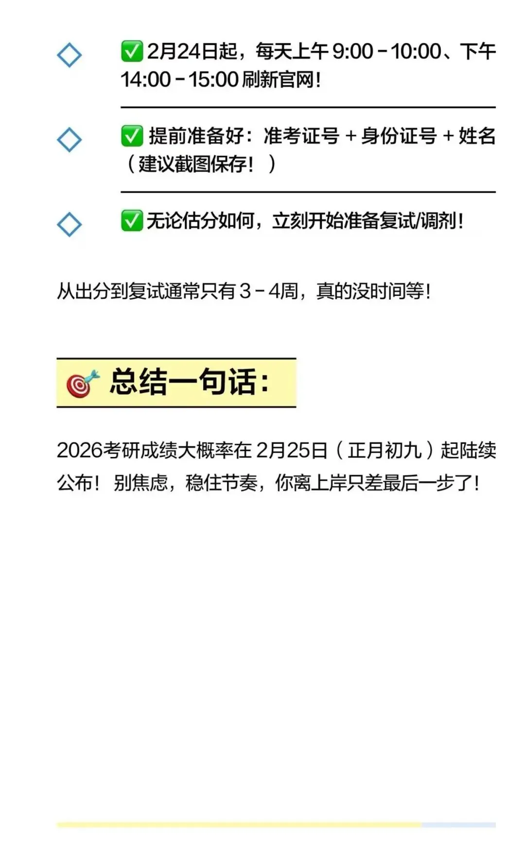 2026考研成绩预计2月25日至28日公布,全国大部分省份在此期间开放查询。建议每天关注官网,准备好准考证号、身份证号和姓名,提前准备复试或调剂。#2026考研 #考研出分 #考研结束 #考研分数线 #查分 #考研复试 #考研调剂