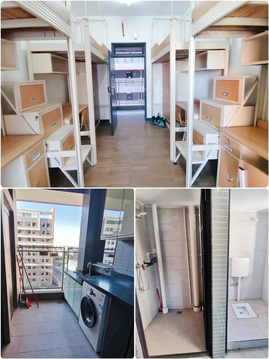 宿舍阳光充足,拥有宽敞阳台,洗手池和独立卫浴(厕所淋浴单独两间),标准4人间,上床下桌,配套齐全。包括空调、热水器、洗衣机、饮水机、衣柜、校园无线网络等生活设施。拎包入住,学习无忧!