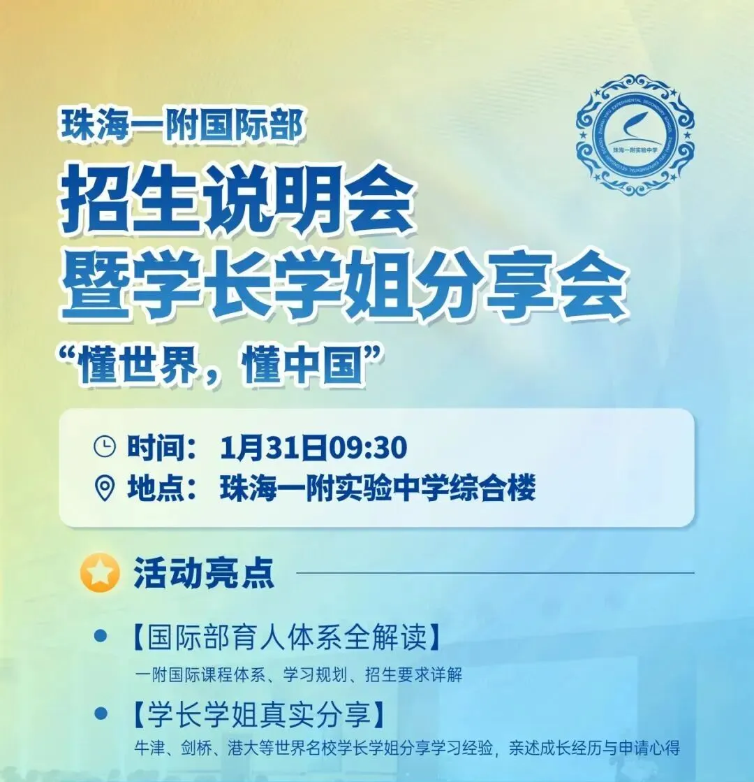 为了帮助家长们了解我校教育教学情况、体验学习环境,我校将于2026年1月31日举行本年度第一场招生说明会暨学长学姐分享会。