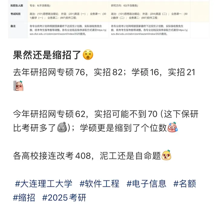 从25考研各院校招生简章来看,不少同学都反馈自己的目标院校缩招了,更猝不及防的是部分院校直接停招,连报考的资格都没了,只能临时换学校,甚至有同学因此放弃考研。
