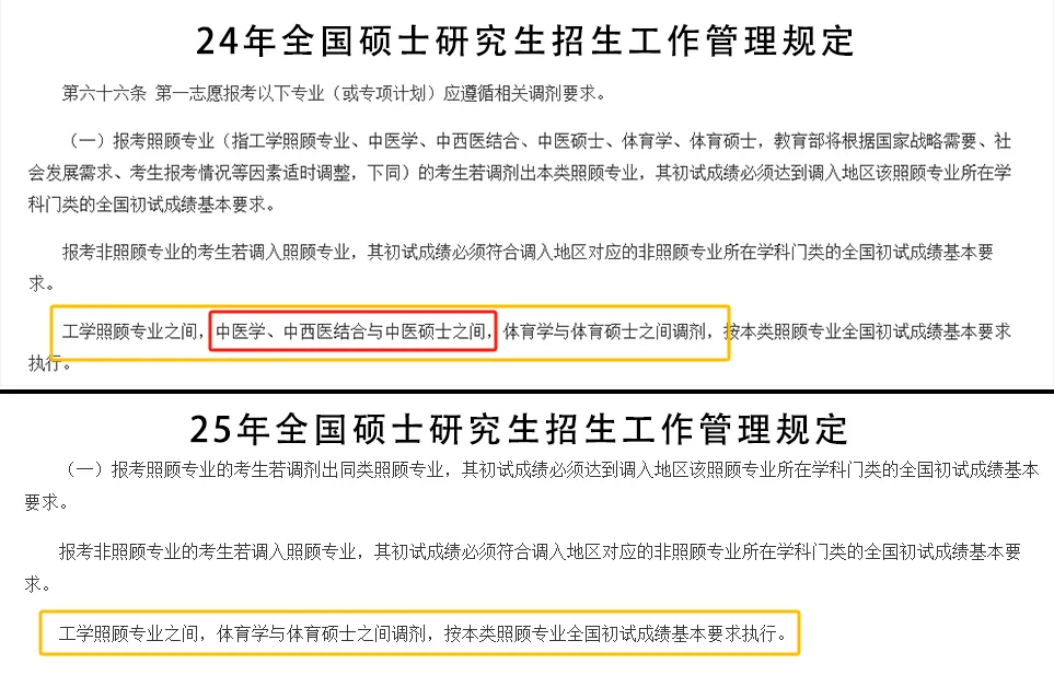 24年的政策里,中医学、中西医结合与中医硕士之间可以互相调剂,按照顾专业国家线执行。但25年把这一项删除了,意味着这类专业的调剂规则会更明确,跨类调剂的限制可能会更严。