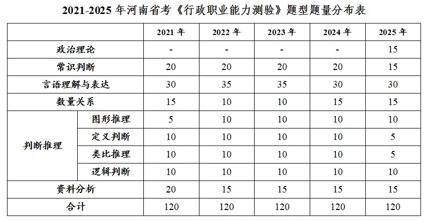 整体来看,行测考查题量依旧为120题,但考查内容有所变化。此次考试紧随国考命题趋势,除了考查常识判断、言语理解与表达、数量关系、判断推理、资料分析外,今年增加考查政治理论。具体如下:
