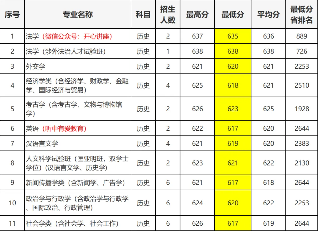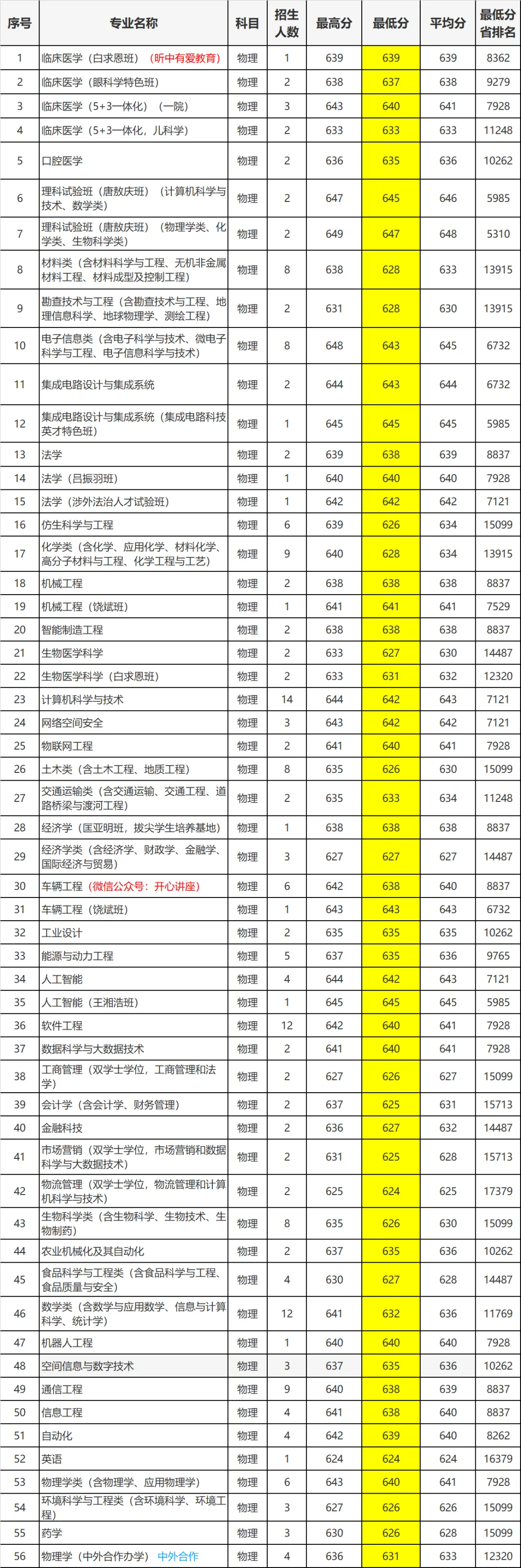 中分考生(物理类625-639分):可选择普通王牌专业(如车辆工程普通班、机械工程、化学类)或复合培养专业(如工商管理+法学)。