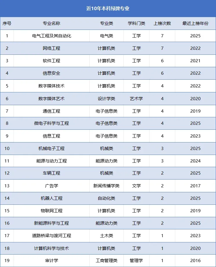 其中,上榜次数最多的是电气工程及其自动化、网络工程,均达到7次;其次是软件工程和信息安全,均为6次。整体来看,绿牌专业多集中在信息技术、先进制造和新能源等领域,这也反映出当前产业发展的重点方向。