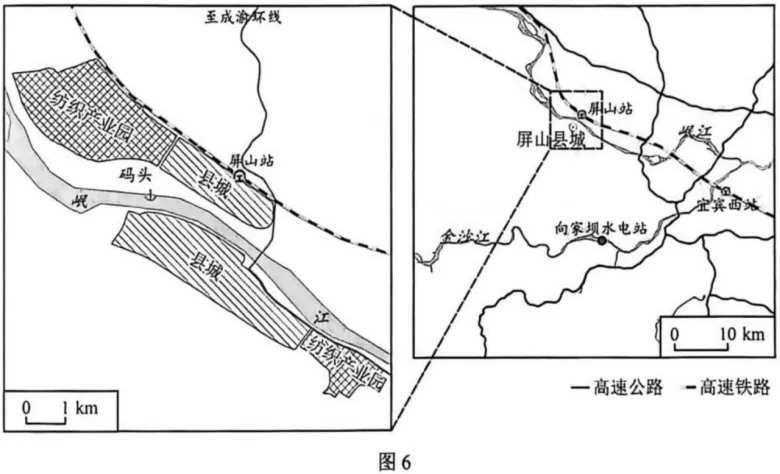 2012年四川屏山县城因向家坝水电站建设而整体搬迁至新址。随后,国家东西部产业协作共建的大型纺织产业园落户屏山县,引进了智能制造程度高、研发能力强的45家大型纺织企业。园区企业与高校院所合作研发竹纤维复合纺织新材料、优化纤维混纺工艺等。屏山县及周边地区生长着300多万亩竹林,形成“竹林基地+农户+产地竹浆粕初加工+园区企业精深加工”的竹资源开发利用模式。图6示意屏山县城及纺织产业园位置。