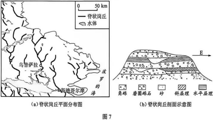 瑞典乌普萨拉分布着高20~40m、宽200~300m的脊状岗丘地貌,它是冰川与冰下河流共同作用的产物。岗丘主体为相互叠置的松散砂、砾石层。岗丘两侧地面上保留有与脊线走向大致平行的大量深擦痕。图7是脊状岗丘平面分布和剖面示意图。
