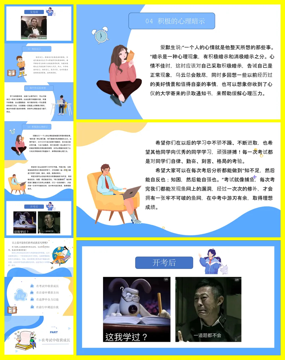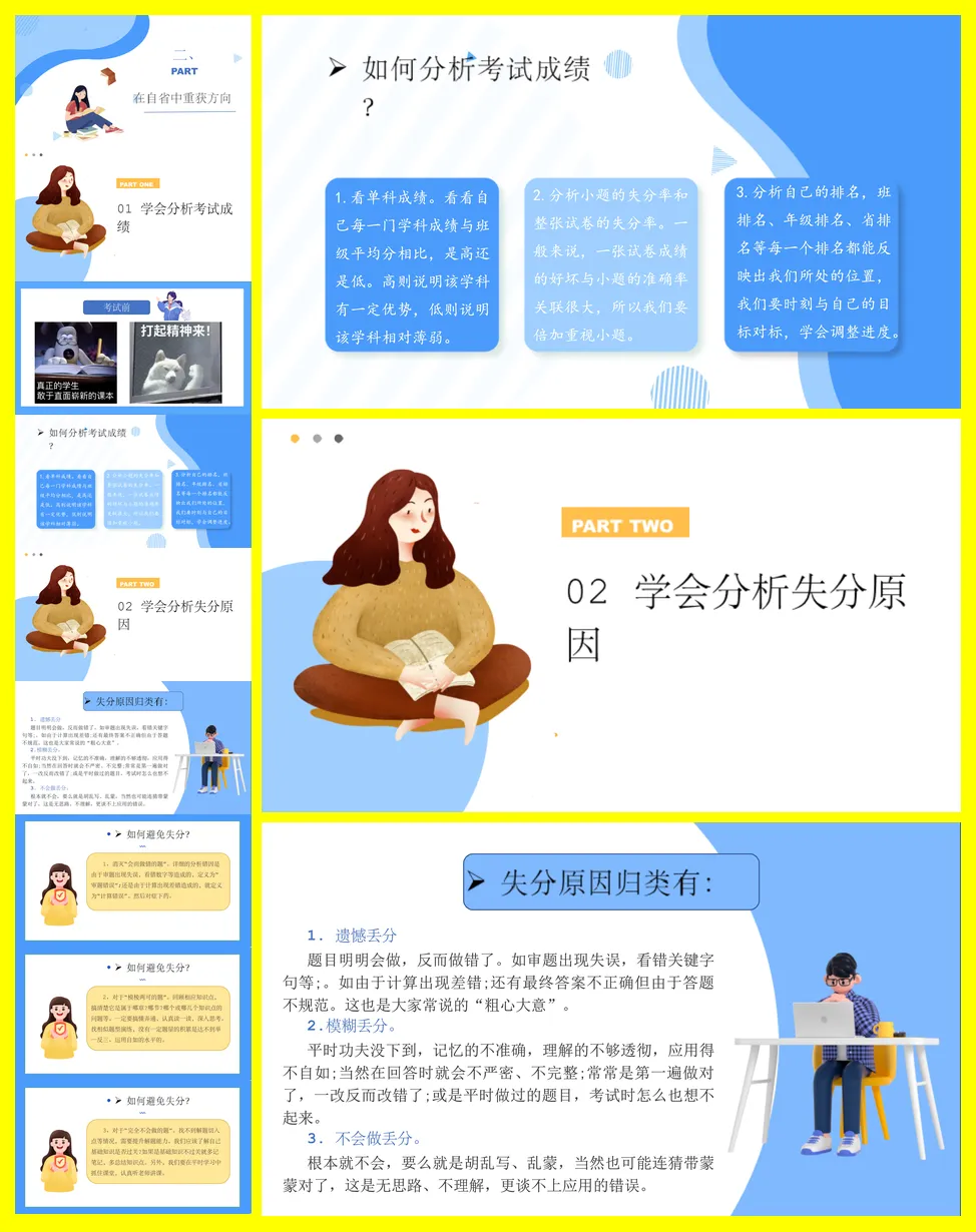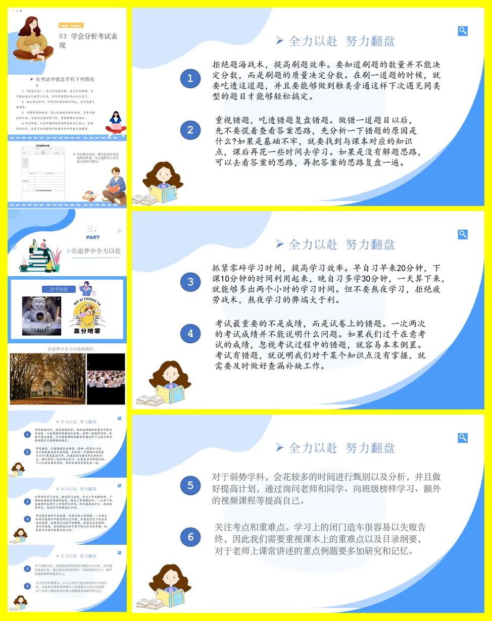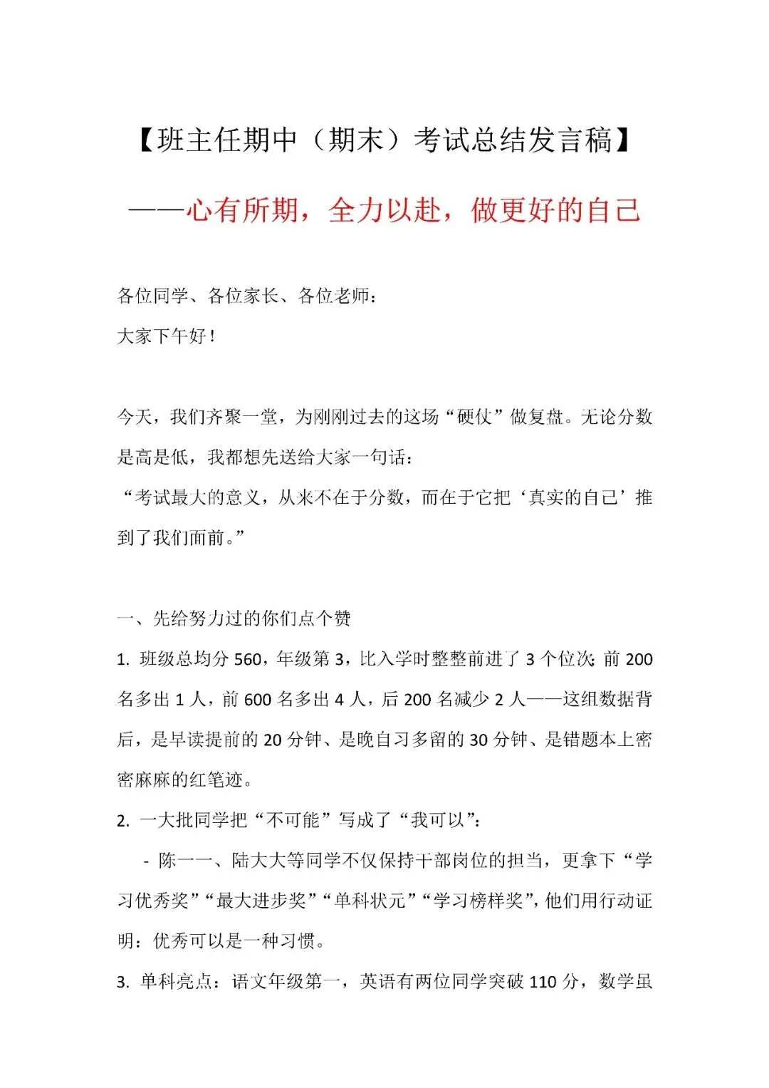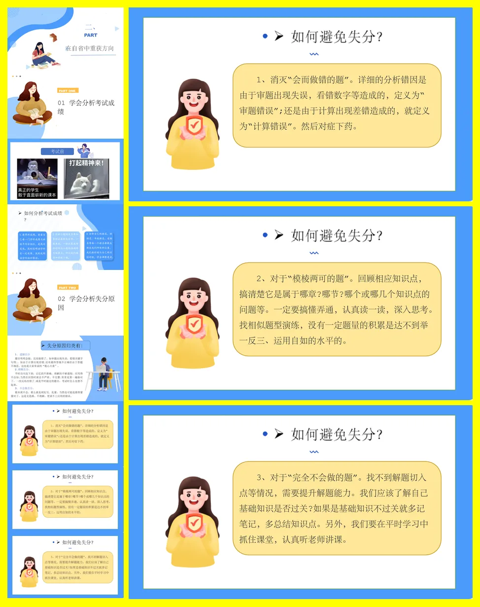 班主任在期中或期末考试总结班会,核心主题是“心有所期,全力以赴,做更好的自己”。发言稿首先肯定了班级整体和部分同学取得的进步,并对考试失利的同学表达了理解与鼓励。随后,发言稿将考试中暴露的问题系统性地归纳为三类:“遗憾丢分”、“模糊丢分”和“完全不会”,并针对每类问题提供了具体可行的解决策略,如使用“三件套”工具、应用“费曼学习法”和分解知识点等。