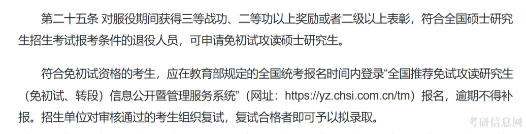 教育部在《2026年全国硕士研究生招生工作管理规定》中,以往符合免初试资格的只有在部队荣立二等功以上的退役人员,今年这一范围得到了扩展,增加了对服役期间获得三等战功的退役人员的免初试攻读硕士研究生的资格。